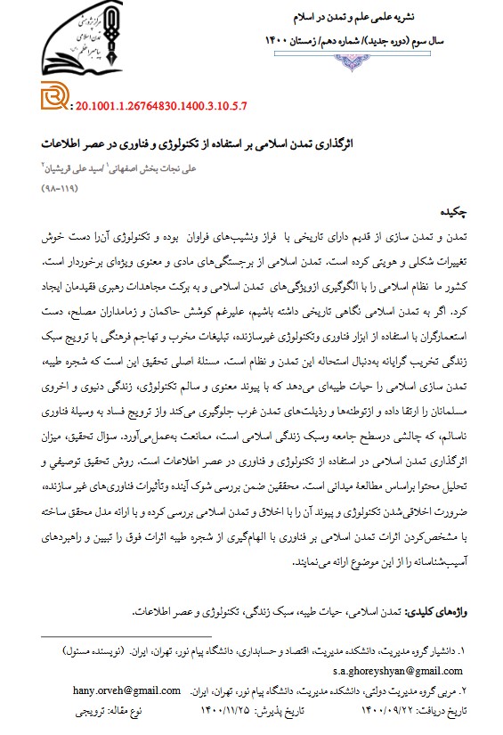 تمدن و تمدن سازی از قدیم دارای تاریخی با  فراز ونشیب­ های فراوان  بوده و تکنولوژی آن­ را دست خوش تغییرات شکلی و هویتی کرده است. تمدن اسلامی از برجستگی­ های مادی و معنوی ویژه­ای برخوردار است. کشور ما  نظام اسلامی را با الگوگیری از ویژگی­های  تمدن اسلامی و به برکت مجاهدات رهبری فقیدمان ایجاد کرد. اگر به تمدن اسلامی نگاهی تاریخی داشته باشیم، علیرغم کوشش حاکمان و زمامداران مصلح، دست استعمارگران با استفاده از ابزار فناوری وتکنولوژی غیرسازنده، تبلیغات مخرب و تهاجم فرهنگی با ترویج سبک زندگی تخریب گرایانه به­ دنبال استحاله این تمدن و نظام است. مسئلۀ اصلی تحقیق این است که شجره طیبه، تمدن سازی اسلامی را حیات طیبه ­ای می­دهد که با پیوند معنوی و سالم تکنولوژی، زندگی دنیوی و اخروی مسلمانان را ارتقا داده و ازتوطئه ­ها و رذیلت­ های تمدن غرب جلوگیری می­کند واز ترویج فساد به وسیلۀ فناوری ناسالم، که چالشی درسطح جامعه وسبک زندگی اسلامی است، ممانعت به ­عمل­می ­آورد. سؤال تحقیق، میزان اثر­گذاری تمدن اسلامی در استفاده از تکنولوژی و فناوری در عصر اطلاعات است. روش تحقیق توصیفی و تحلیل محتوا براساس مطالعۀ میدانی است. محققین ضمن بررسی شوک آینده وتأثیرات فناوری­ های غیر سازنده، ضرورت اخلاقی­ شدن تکنولوژی و پیوند آن را با اخلاق و تمدن اسلامی بررسی کرده و با ارائه مدل محقق ساخته با مشخص ­کردن اثرات تمدن اسلامی بر فناوری با الهام­ گیری از شجره طیبه اثرات فوق را تبیین و راهبردهای آسیب­ شناسانه را از این موضوع ارائه می­نمایند.