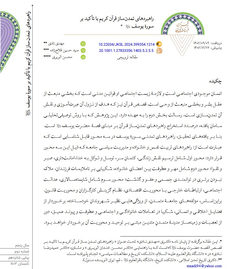 مقاله: راهبردهای تمدنساز قرآن کریم با تأکید بر سورۀ یوسف (ع)